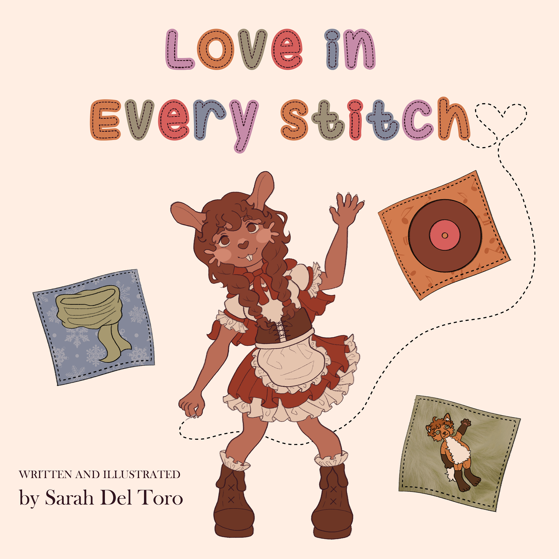 Love in Every Stitch is a dedication to how interactions with others positively impact a person throughout their life and is targeted towards children. I created the writing, illustration, and book design. I started with brainstorming and writing a cohesive but simple story a child could grasp and relate to. Then I fleshed it out further by drawing thumbnails using my original character, Lulette. I considered pacing throughout the spreads, alternating between headshots, busts, full body shots, and other close-ups to create a sense of movement. The composition of each page also avoids clutter while leading the eye from one part to the next.